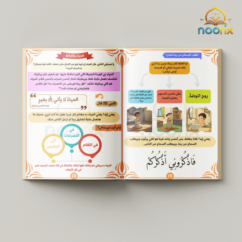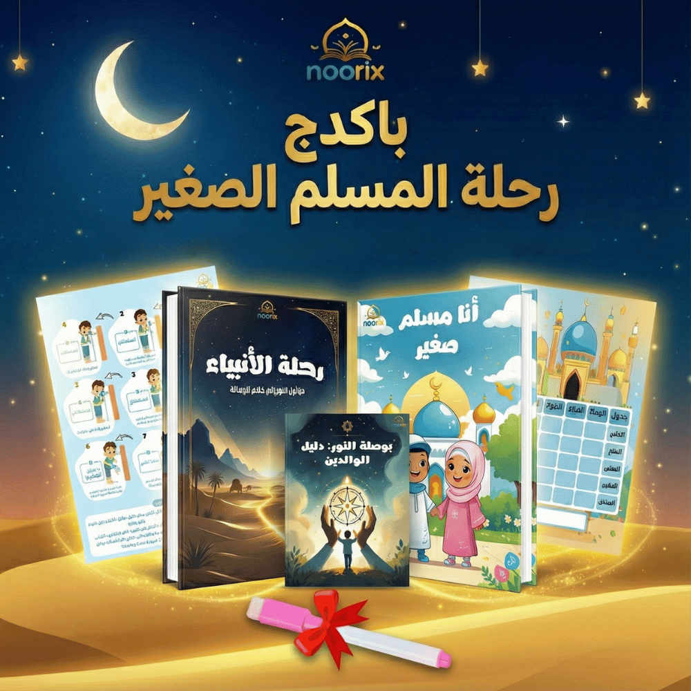 باكدج Noorix لتعليم الأطفال الدين والقيم بأسلوب ممتع: كتب، جدول صلاة، بوستر وضوء، وكتيب للوالدين.